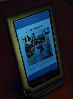 Reading: The color nook will display EPUB (including Non or Adobe DRM), PDF (above), XLS, DOC, PPT, PPS, TXT, DOCM, XLSM, PPTM, PPSX, PPSM, DOCX, XLX, and PPTX files. There are 6 font sizes and you can select from 6 font styles, background color, line and margin spacing. Switching pages is as easy as a tap on the left or right edge of the screen, or you can give it a left or right swipe. Is there color in that document?  You'll love the Nook's screen then.